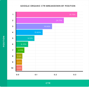 Gute Frage. Studien haben gezeigt, dass 31,7 % der Nutzer auf das erste organische Suchergebnis (Position eins) klicken; satte 75,1 % aller Klicks gehen auf die ersten drei Suchergebnisse. Danach schrumpft die Zahl der Klicks mit jeder weiteren Position rapide.