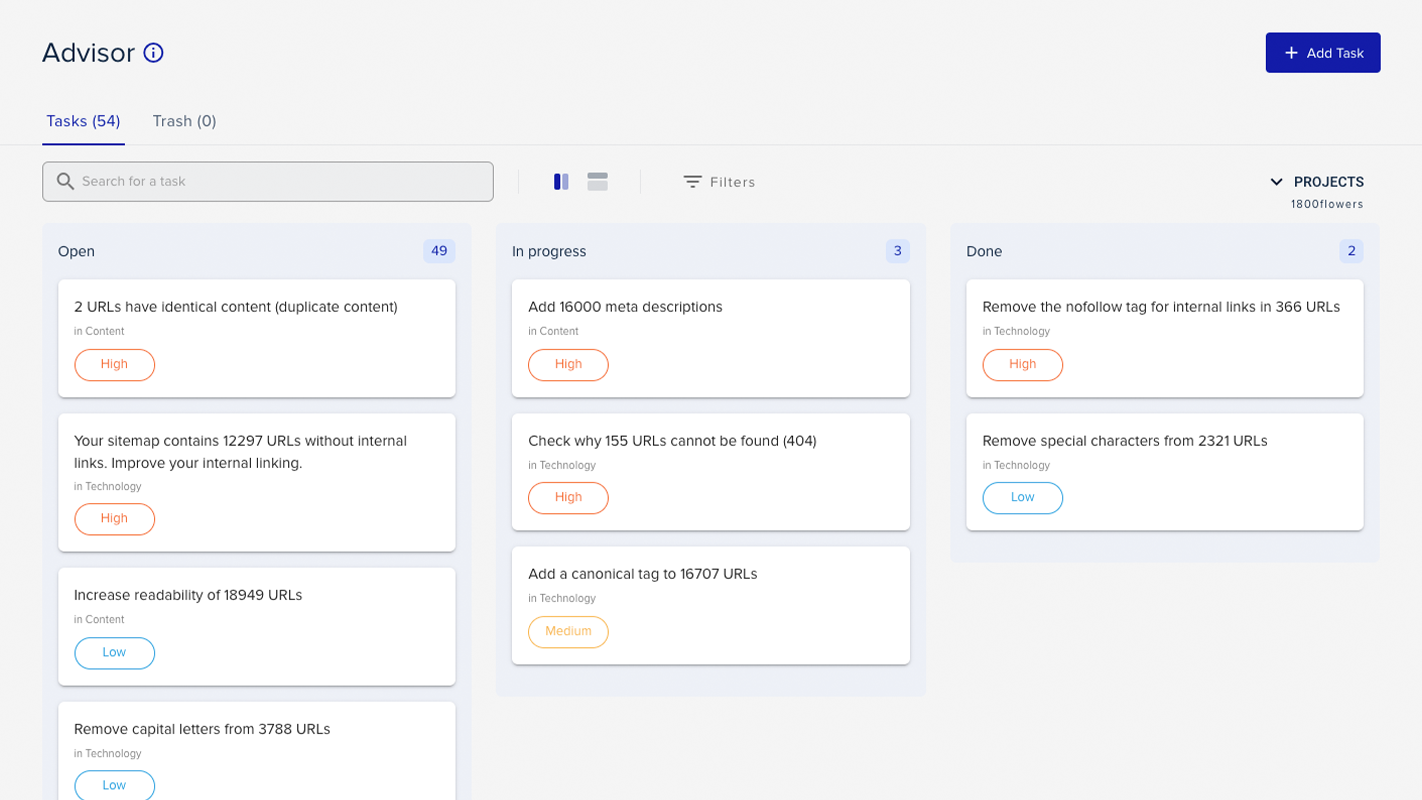 Schauen Sie sich zunächst deb Advisor-Bereich an, indem Sie in der oberen Navigationsleiste auf Advisor klicken. Es handelt sich um ein Kanban-Board, die Ihnen hilft, Ihre Aufgaben nach Status zu organisieren. Ihre Aufgaben sind nach Wichtigkeit farblich gekennzeichnet: